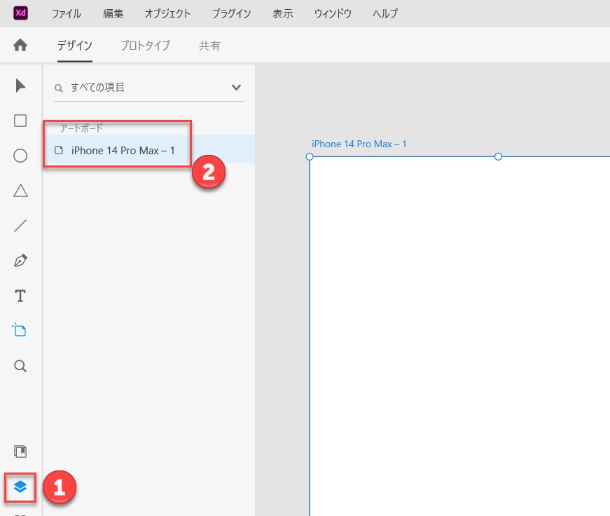 アートボードを選択し、左下の「レイヤー❶」をクリックすると、レイヤーパネル❷上に表示されます。