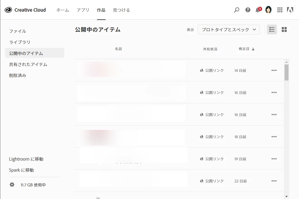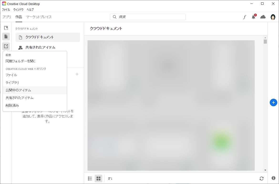 CCデスクトップアプリを開いて、上のメニューから「作品」を選びます