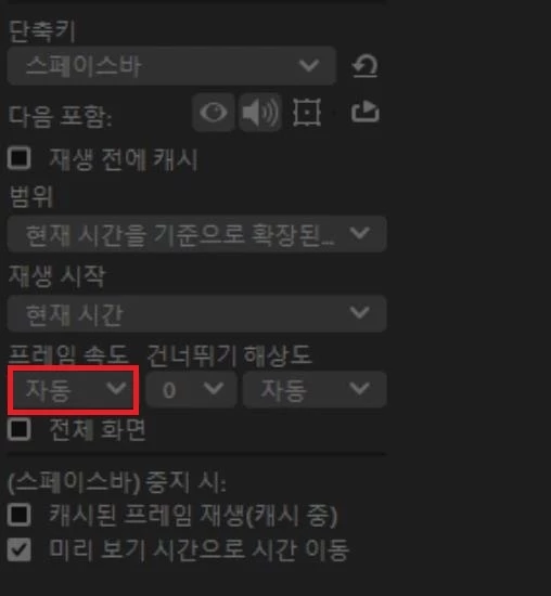 추가적으로  특정 푸티지를 불러왔을 때, 미리보기 패널의 프레임 속도가 자동(Auto)으로 되어 있어 컴포지션 세팅을 제대로 불러오지 못하는 경우도 있습니다.