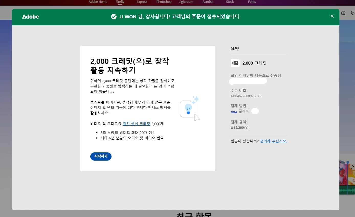 구매 후 주문이 접수되었습니다 창에서 시작하기 버튼과 X 버튼이 안눌려서 새 창을 띄어서 크레딧을 확인해보니 충전이 안됐습니다.