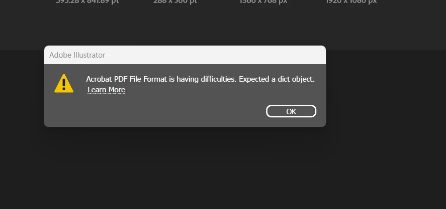 Illustrator 30.2 버전 및 30.2.1 버전에서 작업 후, 일반 저장 및 CS6 버전으로 내보내기 등, 해당 작업으로 진행시 생성된 파일을 타 PC 및 하위버전에서 실행 시 위와 같은 오류 팝업 및 아래와 같은 문구가 노출되며 열리지 않는 현상이 있습니다.