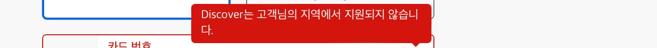 보보민5E44ParticipantForum|Forum|1 year agoSeptember 22, 2024Answered결제방법에서 discover는 고객님의 지역에서 지원되지 않습니다 라고 뜹니다Forum|Forum|1 year agoSeptember 22, 20241 reply233 views