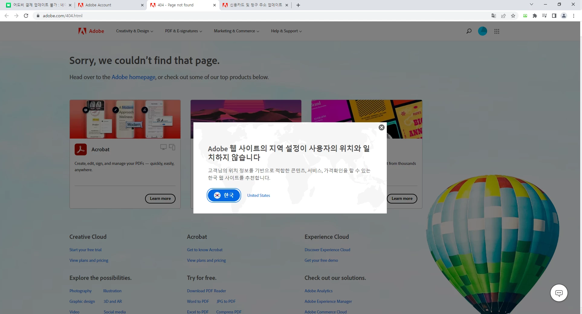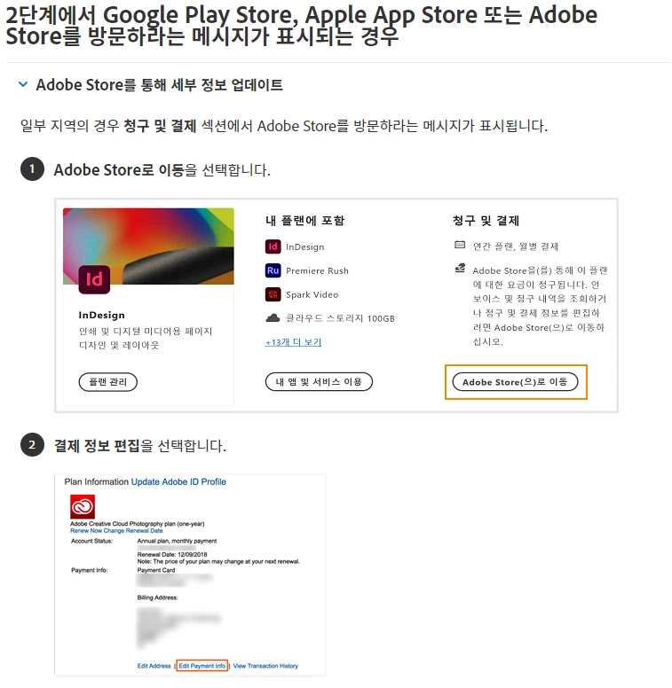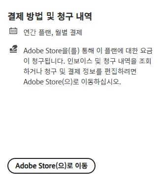 계정 관리에서 업데이트를 하려고 하니 adobe store로 이동하라고 하고 adobe store로 이동 버튼을 누르면 404 page not found 라는 오류가 뜨면서 접속이 불가능해 다른 방법으로 우회해서 접속해야 하나 싶어 우회하려고 하면 결국엔 한국 페이지로 들어와 다시 스토어로 들어오라는 버튼이 나옵니다.