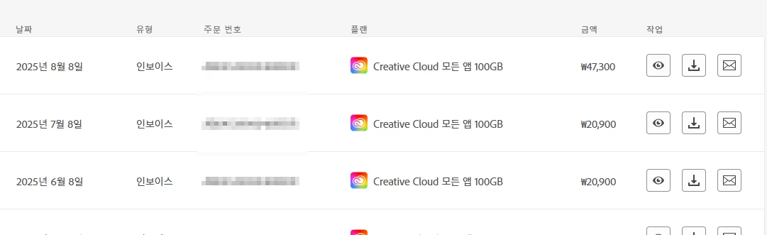 [ 구독 갱신 알림 ] 등의 제목으로 메일이 제공되지는 않았는지, 스팸 메일함에 제공되었거나 메일함의 용량이 가득 차 제공받지 못한 건 아닌지 확인해 보시는 게 좋을 듯합니다. Adobe 플랜의 이용 안내는 대부분 메일로 제공되기 때문입니다.