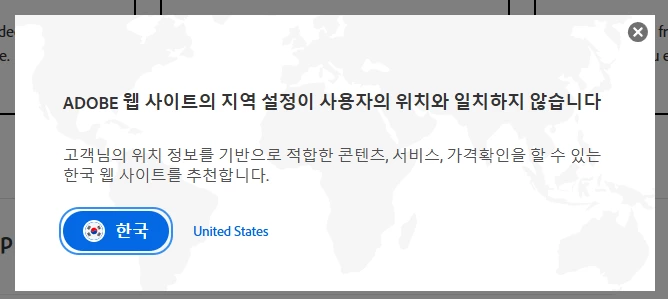 계정에 구독이 있는경우는 어도비 홈페이지 제일 하단에 보면 지역변경 버튼이 있고 지역변경을 진행할수 있습니다.