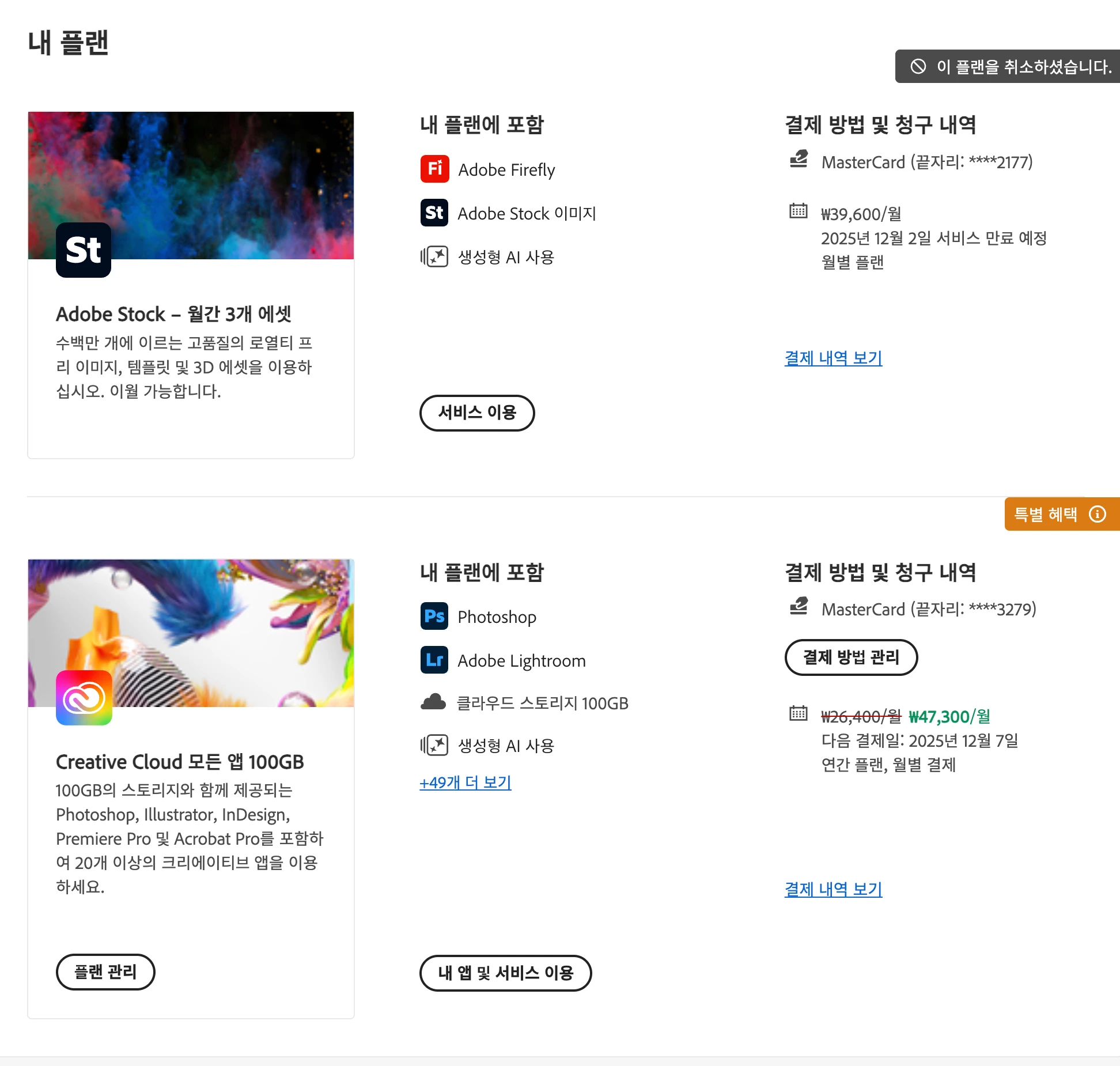 NNara_Ok6732ParticipantForum|Forum|3 months agoNovember 8, 2025질문구독 취소 및 환불 요청Forum|Forum|3 months agoNovember 8, 20250 답변들31 조회안녕하세요,지난달까지 사용하고 더이상 사용하지 않을 Adobe Stock 과 Creative Cloud 구독 두 가지를 모두 취소하려고 합니다. 자동결제가 되는 바람에 이미 두 가지 구독이 모두 결제된 상태입니다.첨부 이미지 첨부 드립니다.결제 후 모두 사용한 적 없는 상태이고, 구독 취소 후 환불 요청드립니다.