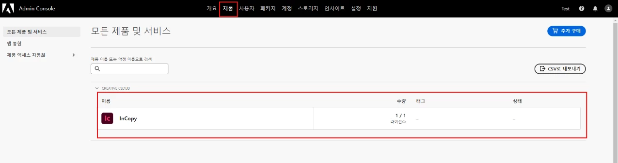 ② 할당할 프로그램 라이선스를 [제품] >[모든 제품 및 서비스] 에서 확인합니다.