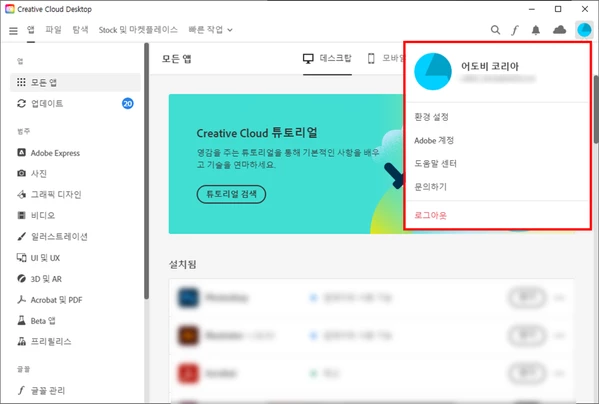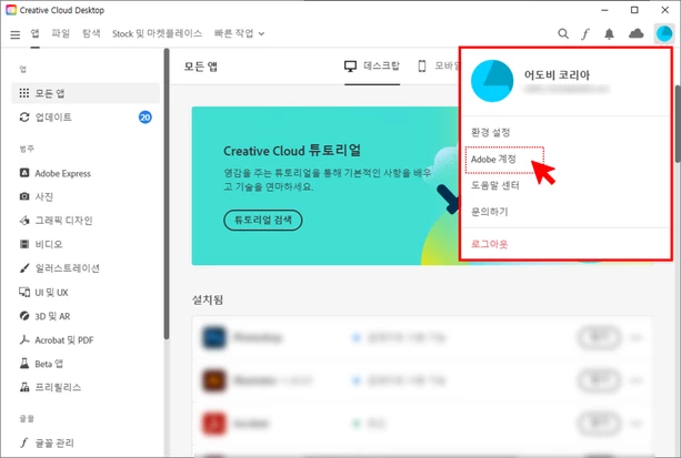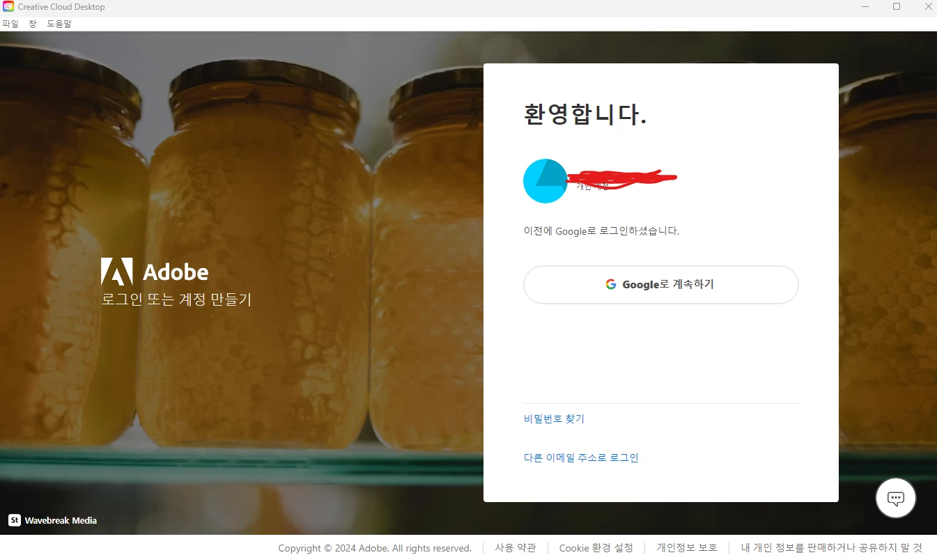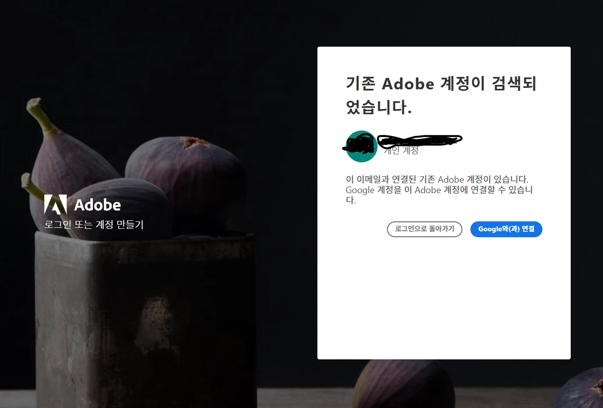 기존에 쓰던 구글 연동된 어도비 계정 말고 어도비 구독이 되어있는 다른 구글계정으로