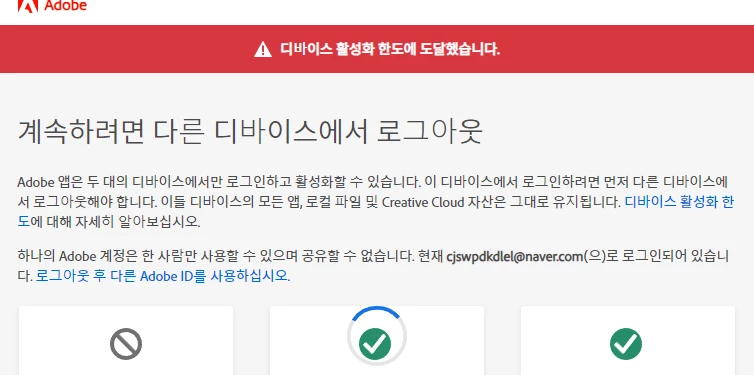 우선 이 경우, 아예 실행 중이던 프로그램을 종료하고 이용을 원하는 PC 외 다른 PC의 Creative Cloud에서 수동으로 로그아웃 해보시는 게 좋을 듯하네요.