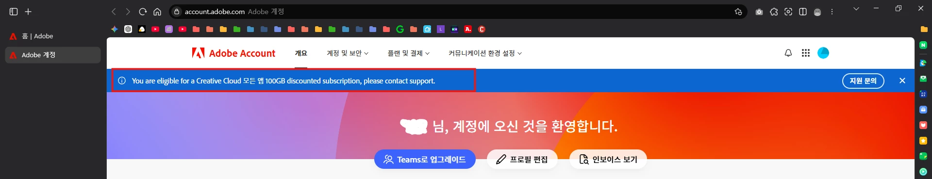 You are eligible for a Creative Cloud 모든 앱 100GB discounted subscripion, please contact support.