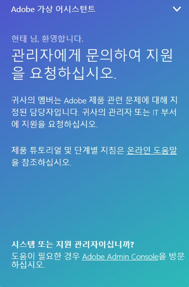 어제까진 잘만 되던 어도비 가상 어시스턴트 창이 아래 같은 상태로 이용할 수 없습니다.