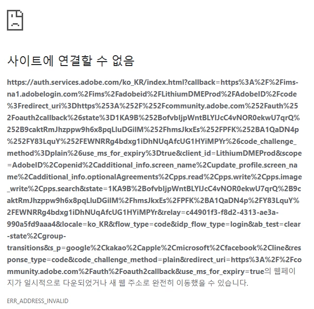 어도비 사이트에 로그인해도 '사이트에 들어갈 수 없습니다'라고 뜨길래 마이크로소프트샵에서 creative cloud desktop 설치했는데도 이렇게 뜨고 안들어가집니다. 다른 게시물에 나온 것처럼 네트워크도 바꿔봤는데 그대로입니다.