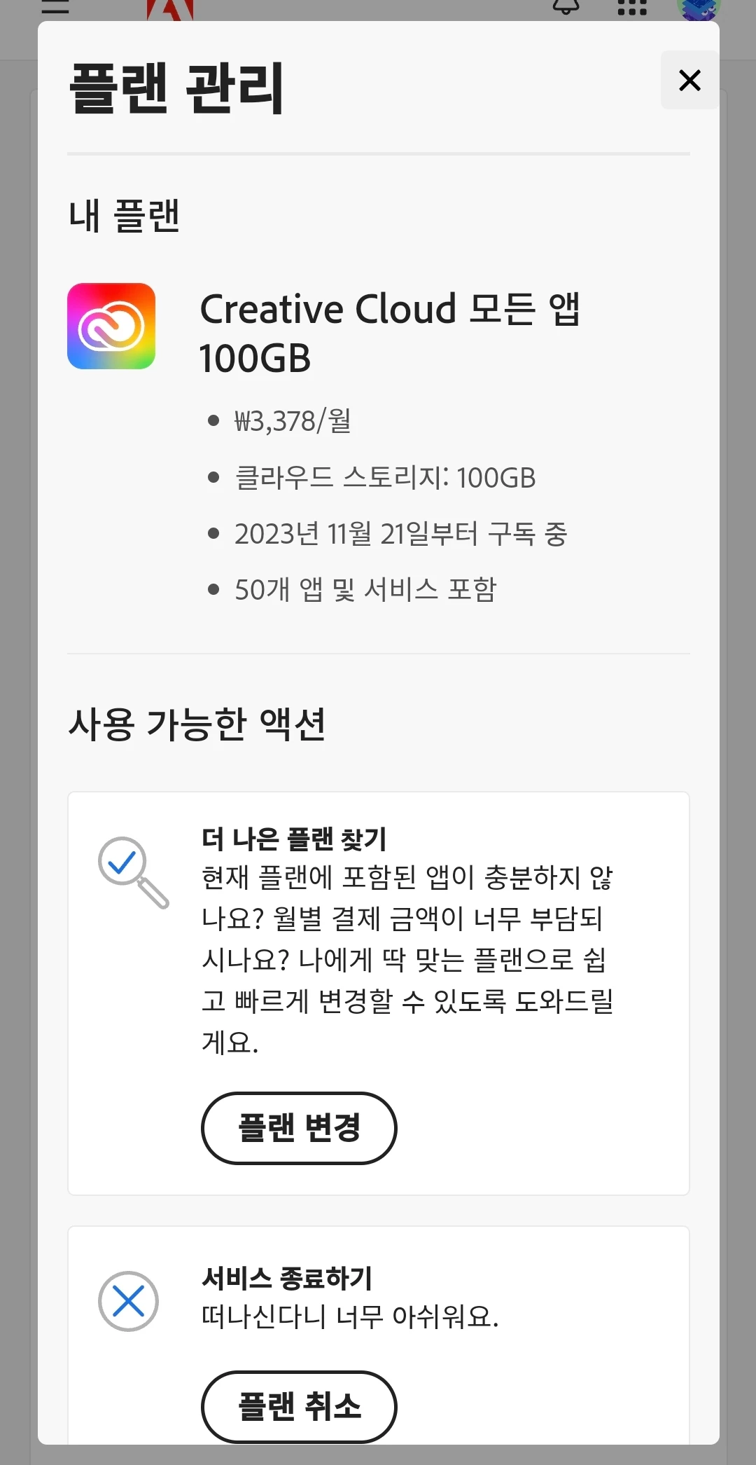 "현재 계정에 대한 상세한 확인이 필요합니다. 아래 고객센터로 문의 주시면 좀 더 꼼꼼하게 확인 가능합니다. Adobe 고객지원 (평일 09:00 ~ 18:00, 주말, 공휴일 휴무) 채팅상담:https://helpx.adobe.com/kr/contact.html"