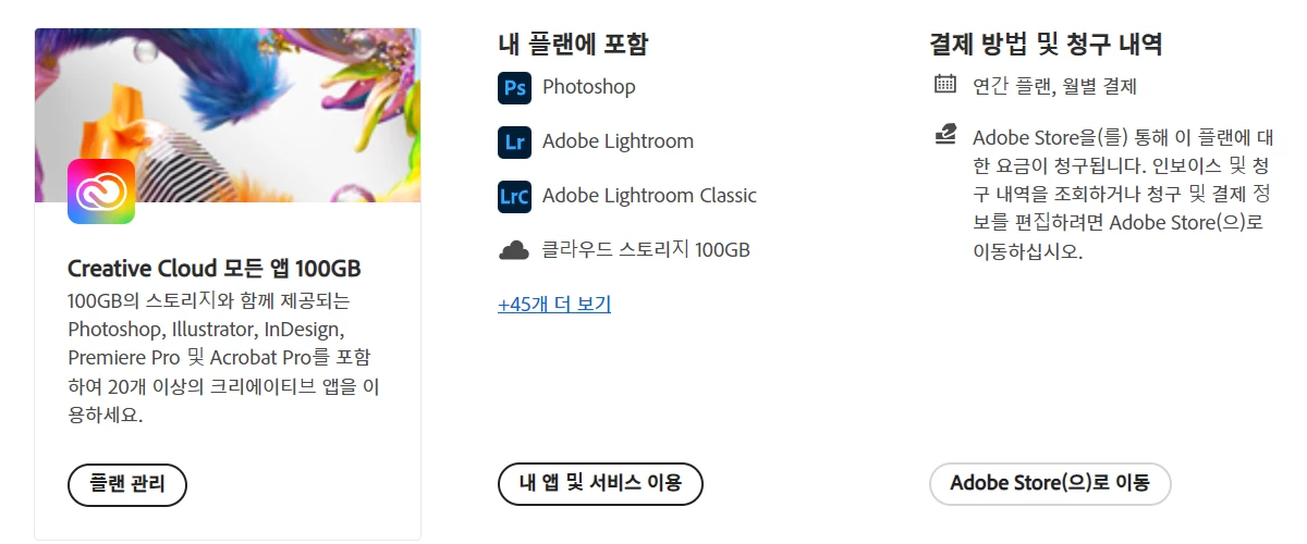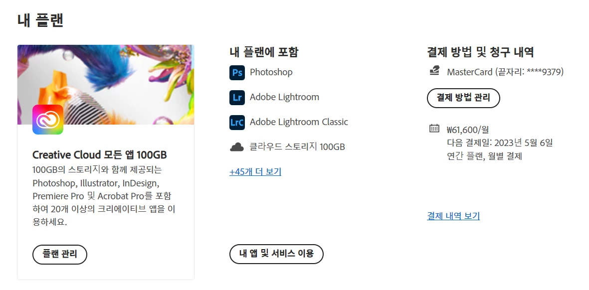 안녕하세요. 전 학생-교사 플랜으로 2020년부터 사용한 유저입니다. 그런데 지난 4월 6일 포토샵을 열어보니 갑자기 새로운 플랜에 가입해야 한다고 해서 전 학생-교사 플랜이 만료된 줄 알고 새로운 플랜에 가입했습니다. 아래 이미지는 제 계정에 있던 새로운 플랜입니다.
