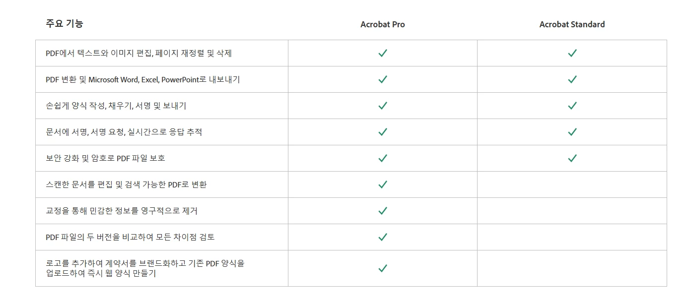 adobe acrobat 라이선스 유형별 차이 궁금합니다.