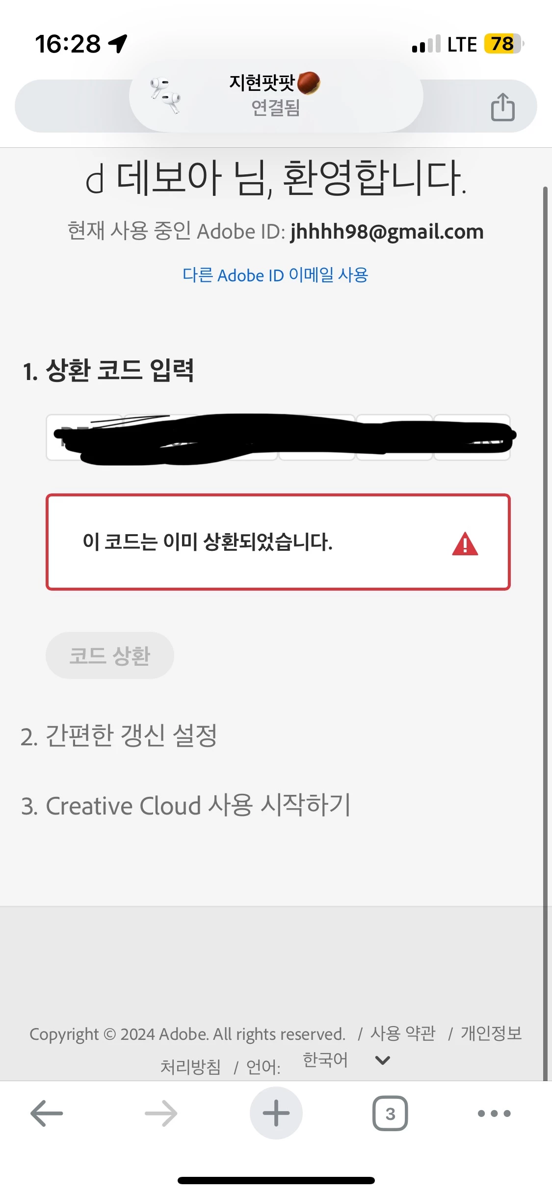 아수스 제품구매 후 어도비 1개월이용권을 사용 하였으나 코드는 상환되었다고 뜨고 아무것도 적용이 안되어있습니다 .