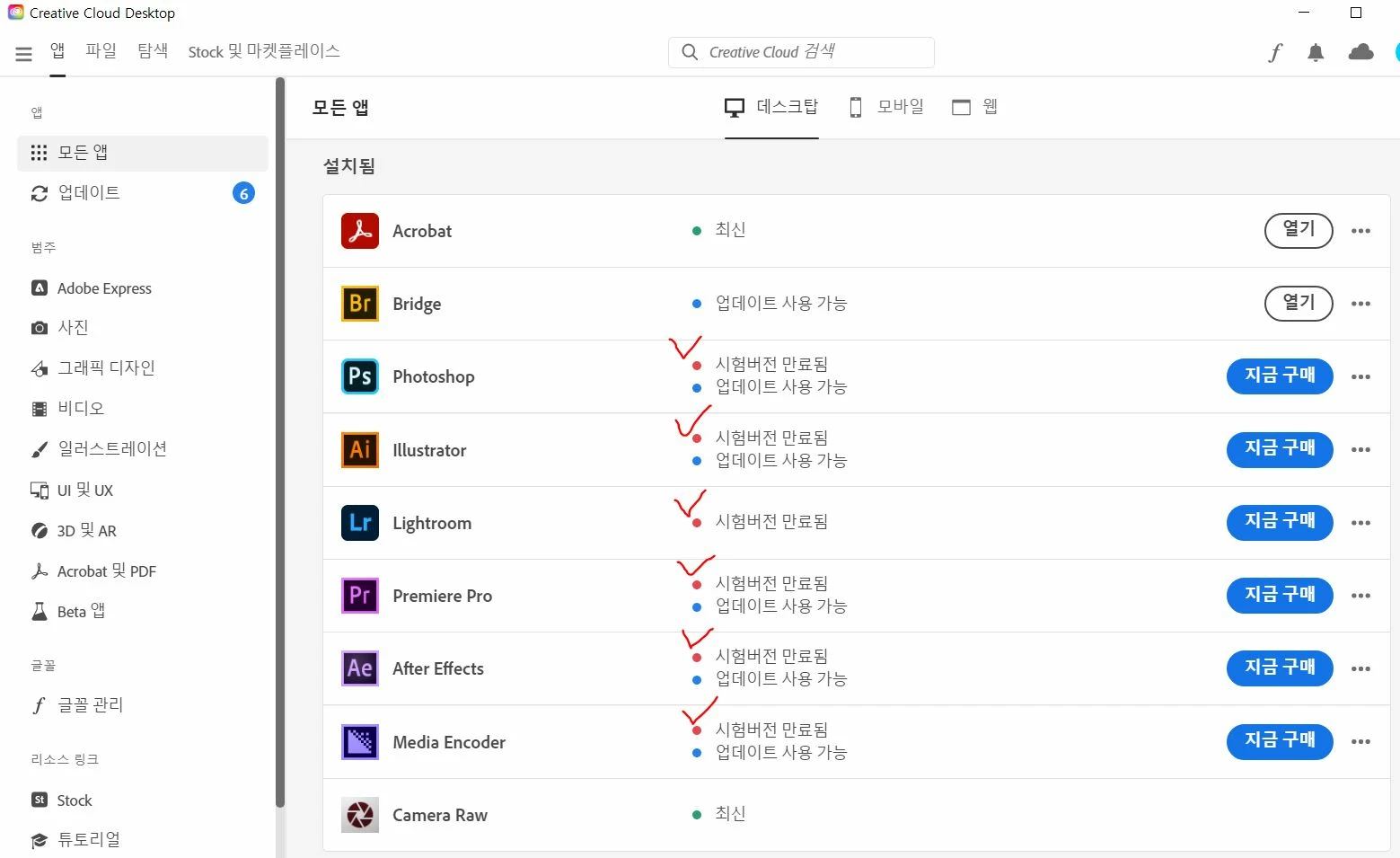 Creative Cloud 플랜 구독 결제는 되었으나 시험버전 만료로 프로그램 사용이 안됩니다.