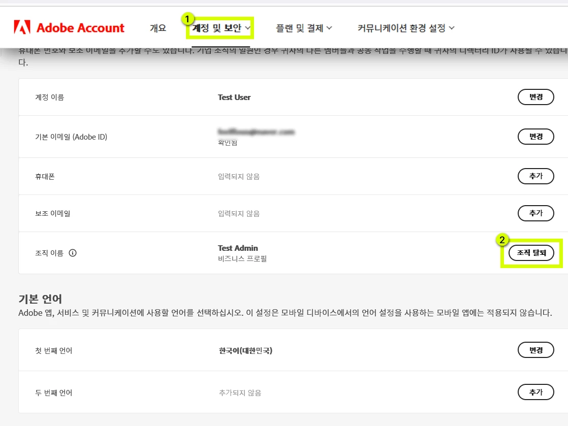 2. 계정 및 보안 > 조직이름 - 조직 탈퇴 선택