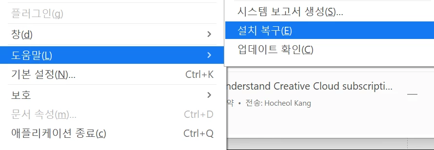 왼쪽상단의 메뉴 > 도움말 > 설치복구를 진행하는 방법이 있고