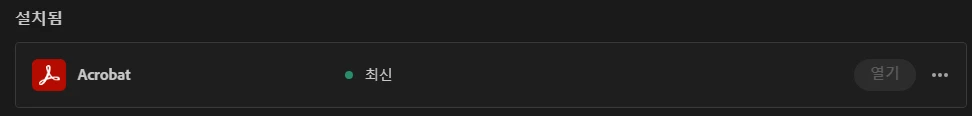 Ddefault28865120nz42tsParticipantForum|Forum|2 years agoMarch 14, 2023Question앱내 acrobay 버튼 미활성Forum|Forum|2 years agoMarch 14, 20231 reply194 viewsAdobe Creative Cloud앱에서 acrobat이 설치된 것으로 나오나 '열기'버튼이 미활성화 되어 있습니다. 윈도우 제어판에도 설치 내역에 acrobat은 없습니다. cloud앱만 있습니다.윈도우 버전은 11입니다.