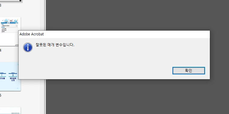 가가람26997883ria8ParticipantForum|Forum|3 years agoNovember 7, 2022Question잘못된 매개변수 입니다.Forum|Forum|3 years agoNovember 7, 20220 replies1082 viewsPDF로 변환한 파일들은 하나의 PDF로 합치는데 중간에 잘못된 매개 변수입니다. 라는 문구가 뜹니다. 그 이후로부터 합치는 파일들 전부 그 멘트가 떠요.그리고 나서 중간에 부분, 어떤 한 페이지를 삭제하려고 하면 삭제가 되지않습니다.잘못된 매개변수입니다. 멘트가 뜬 이후 부터 이런 현상이 나타나요.일부 페이지는 삭제가 되고 또, 어떤 페이지는 삭제가 안되는 현상이 있는데 왜그런걸까요?일반 문제 해결