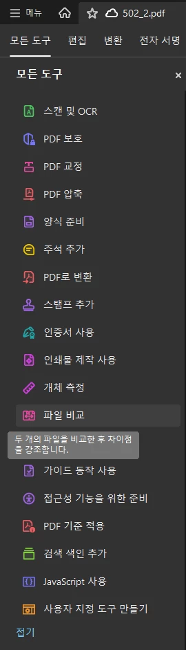 한 번 좌상단의 메뉴 > 도움말 > 설치복구를 진행해 보시고 파일비교 메뉴가 없다면 아크로벳의 주요 기능의 손상으로 UXP백업 초기화를 진행해보고 안될시 한번 아크로 클리너를 통한 삭제후 재설치를 진행해 볼 수 있겠습니다.