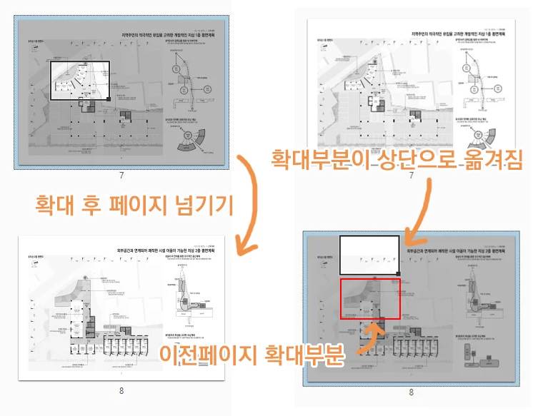 자세한 게시 감사합니다 게시한 내용이 Adobe Acrobat에서 페이지를 넘기면서 특정 확대 위치를 고정하고 싶은 부분으로 보이는데요. 안탑깝게도 기본 확대 값을 설정할 수는 있지만, 특정 위치를 고정하는 것은 불가능합니다. 사용자가 직접 페이지를 넘길 때마다 원하는 위치로 다시 이동해야 합니다.