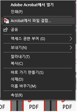 예전엔 PDF를 모두 선택하고 마우스 우클릭 하면 ‘Acrobat에서 파일 결합’ 메뉴가 있었는데