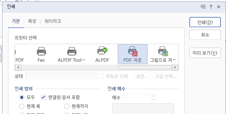 한글 파일 pdf 변환 시 adobe pdf 드라이버 선택이 안 됩니다.
