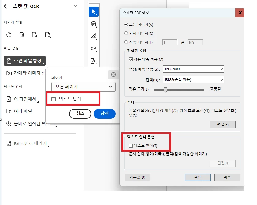 1. 이 두 부분의 텍스트 인식을 꺼주시고, 아크로벳 종료 > 다시 문서를 불러와줍니다.