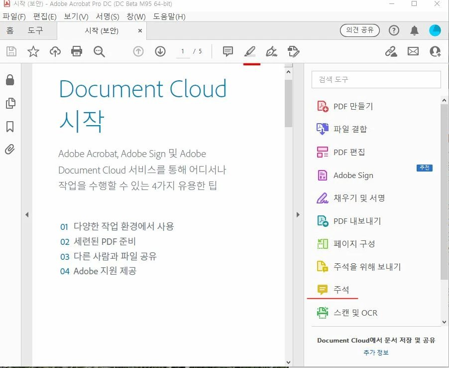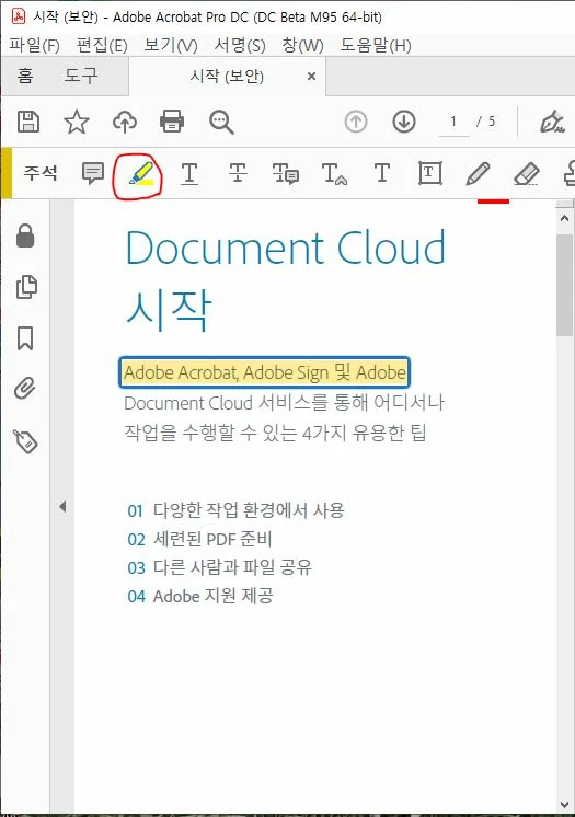 2. 서두에 언급한 주석-텍스트강조(형광펜) 기능이 PDF편집 기능에 종속되어 있기 때문에