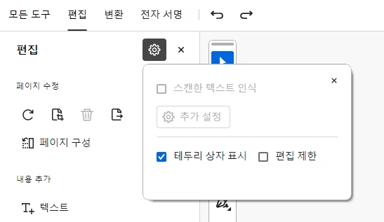 Adode Acrobat 편집탭 누르면 스캔된 파일 변환 비활성화
