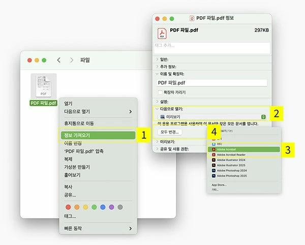 Mac OS에서 Adobe Acrobat을 기본 파일 뷰어로 잘못 설정 했는데 취소 할 수 있는 방법이 있을까요?