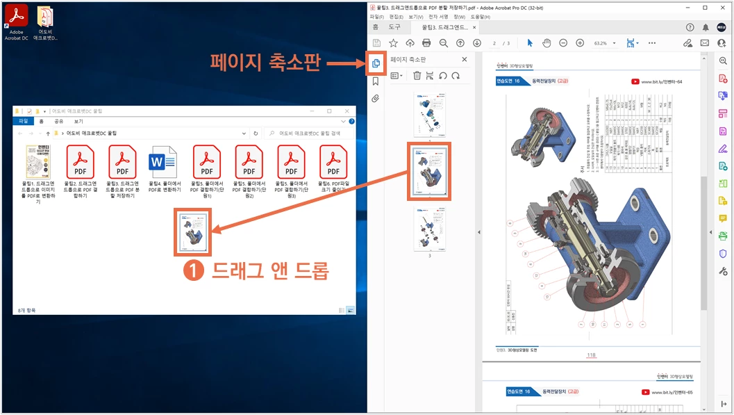 ② 문서파일을 애크로뱃DC의 페이지 축소판으로 드래그 앤 드롭 합니다.