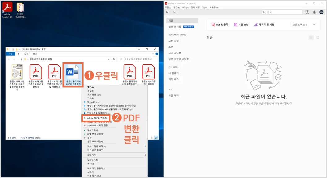 ② 문서에서 우클릭 후 ‘Adobe PDF 변환’을 클릭합니다.