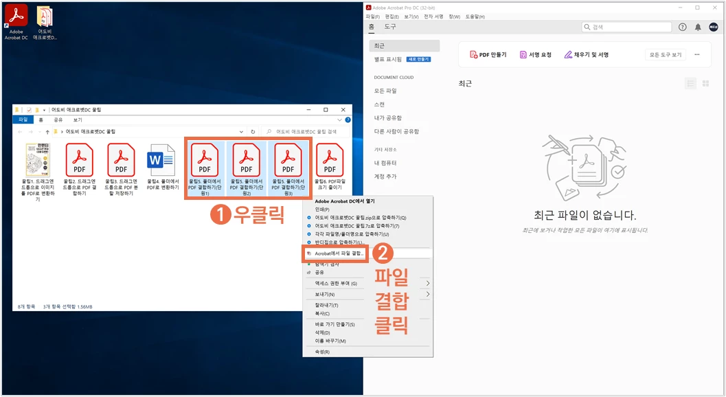 ② PDF를 모두 선택하고 마우스 우클릭 후 ‘Acrobat에서 파일 결합’을 클릭합니다.
