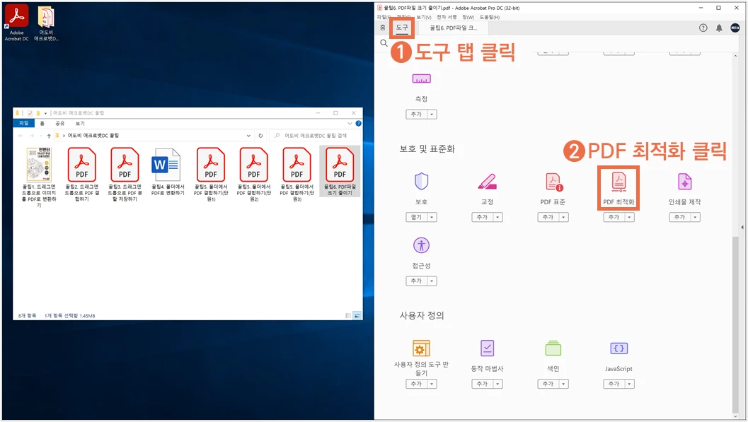 ② 상단의 도구 탭을 클릭하고 보호 및 표준화의 ‘PDF 최적화’를 클릭합니다.