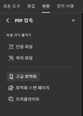 좌상단의 도구창에서 > 변환 > PDF압축 > 고급 최적화
