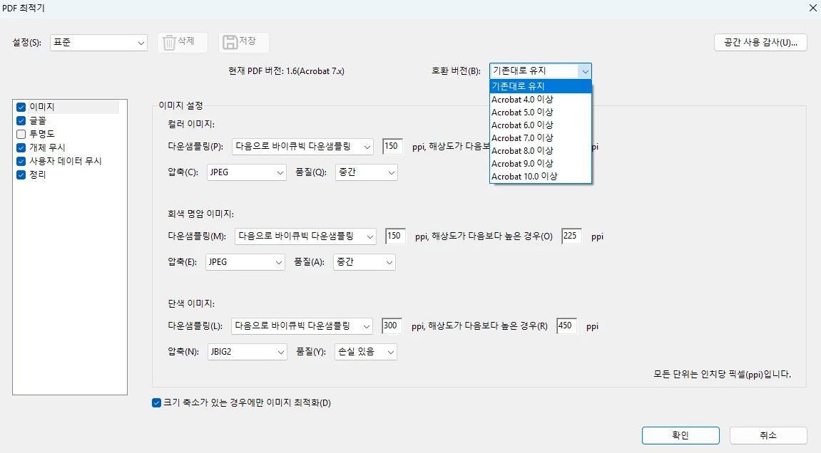 고급 최적화에서 호환버전을 열어보면 버전에 맞게 PDF를 최적화 할 수 있습니다.