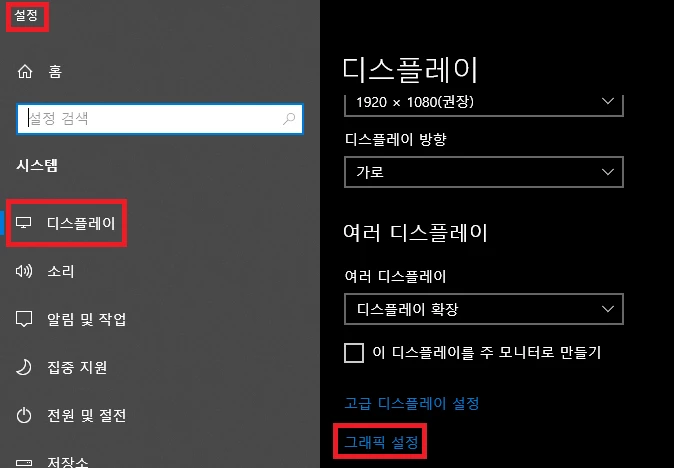 2. 디스플레이 설정 메뉴를 통해 그래픽 설정으로 접속 해주세요.