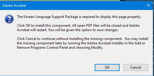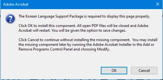 PDF를 처음 열었을때 경고창이 나타나고 OK를 누르면 한글이 설치된다고 하는데 한글설치도 자동으로 안되구요.