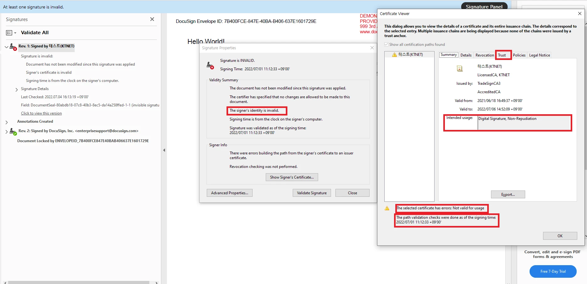 Adobe 신뢰인증서 리스트에 수동으로 인증서를 추가 하였는데, signed1.pdf 은 인증서를 신뢰할수 없다고 발생합니다.