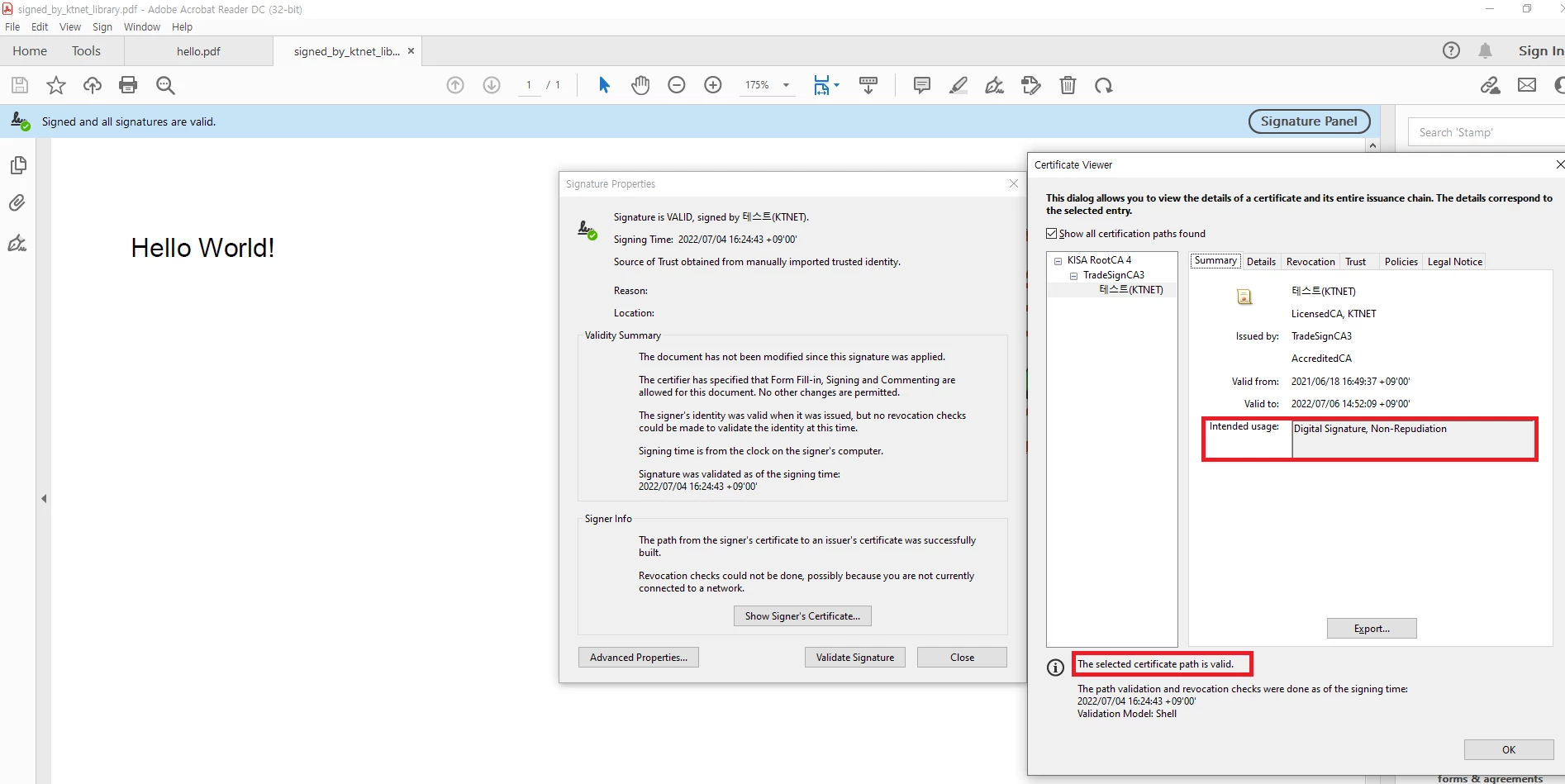 signed1, signed2 pdf 파일을 같은 인증서로 서명하였습니다.