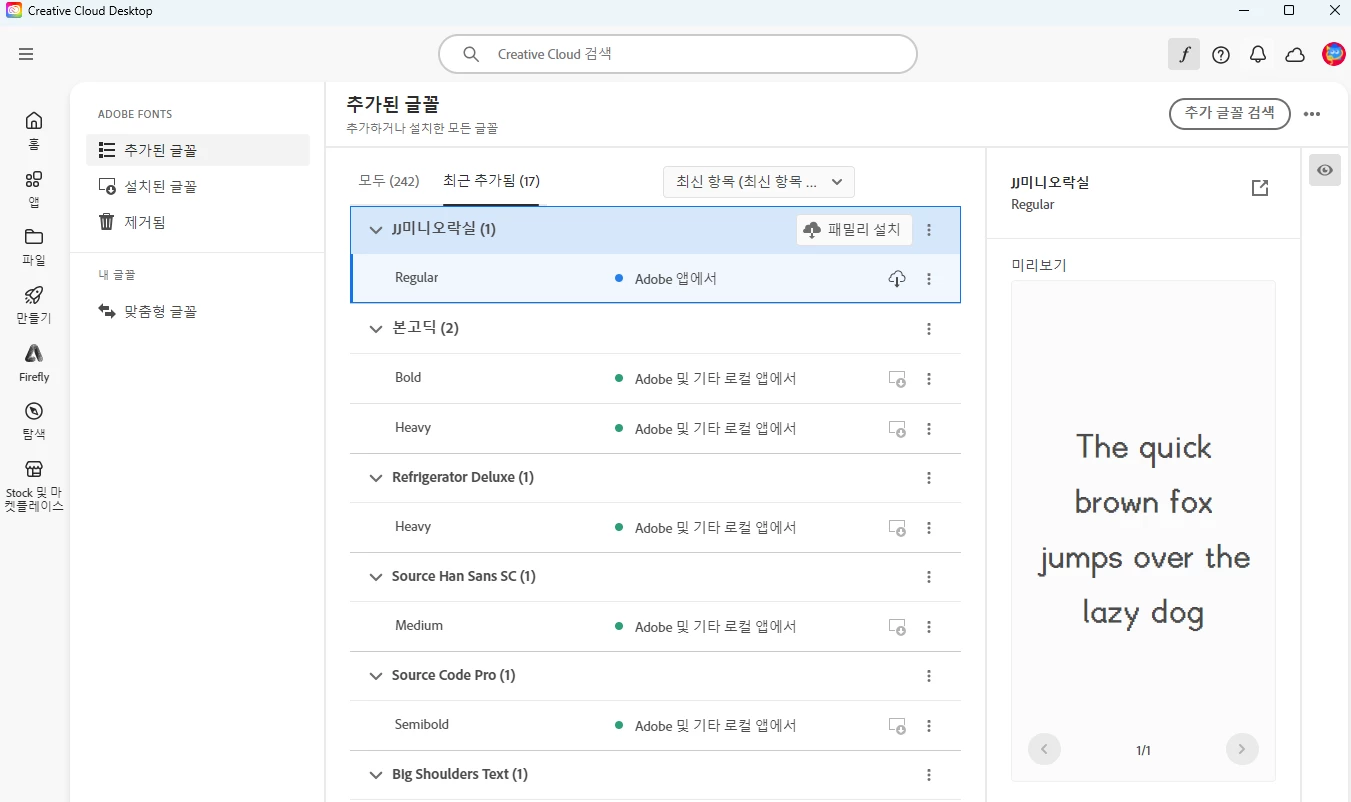 어도비 폰트에 해당 폰트가 존재 하는 경우는 클라우드 > 폰트 메뉴에서 > 패밀리 설치를 진행해 볼 수 있습니다.