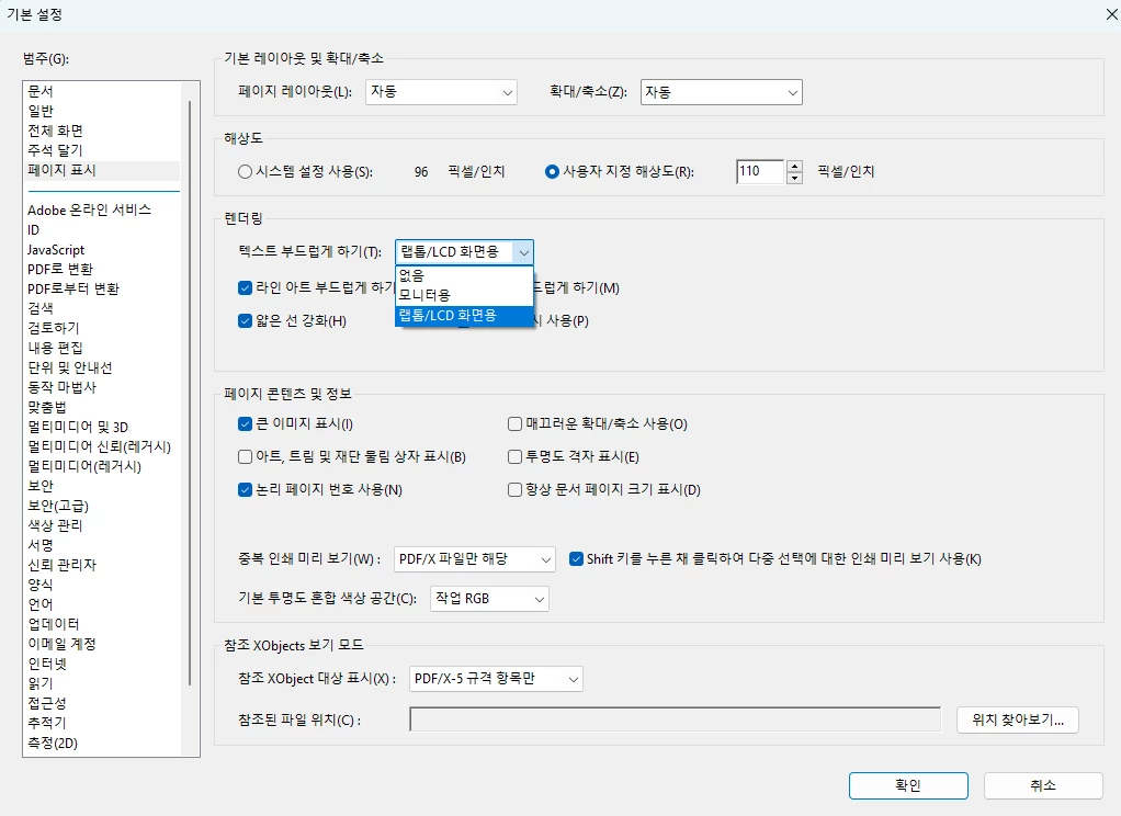 또는 아크로벳의 좌상단의 기본설정(Preferences)을 눌러주시고 > 페이지 표시(Page Display) > 렌더링(Rendering) 메뉴를 '모니터 용'(For Monitor)으로 변경후에 한번 열어 보시겠어요?