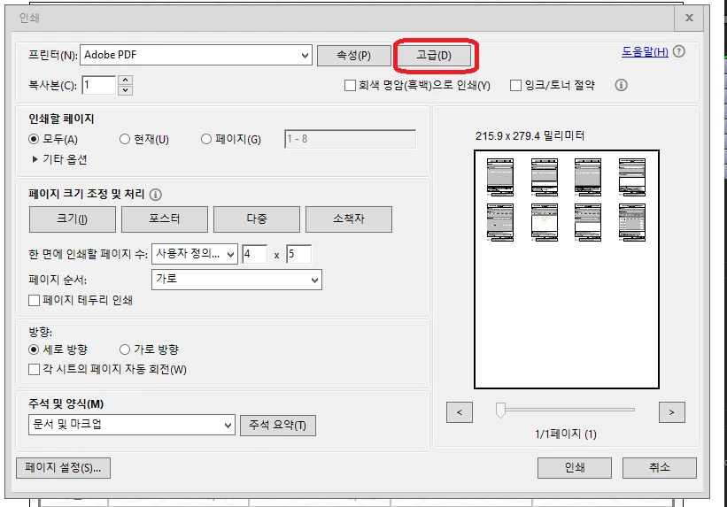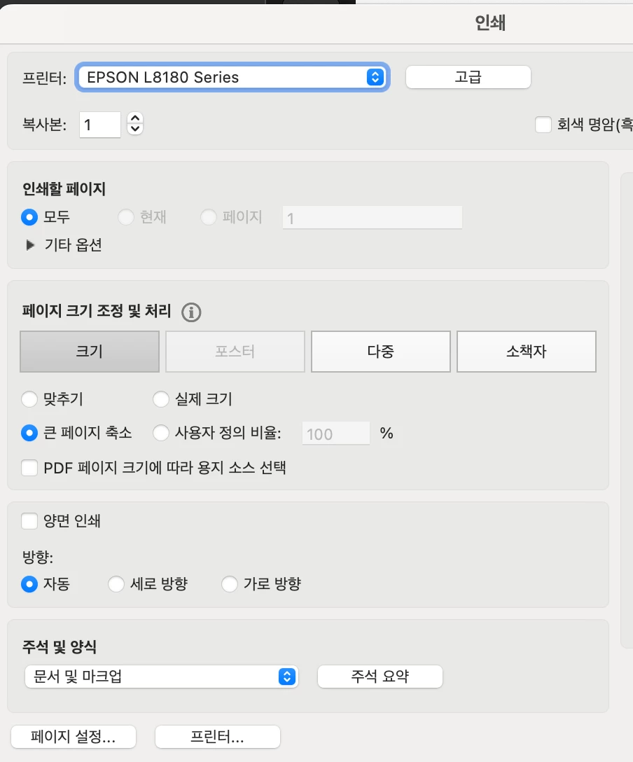 인쇄 - 페이지 크기 조정 및 처리에서 [포스터]만 블럭처리되어있습니다.