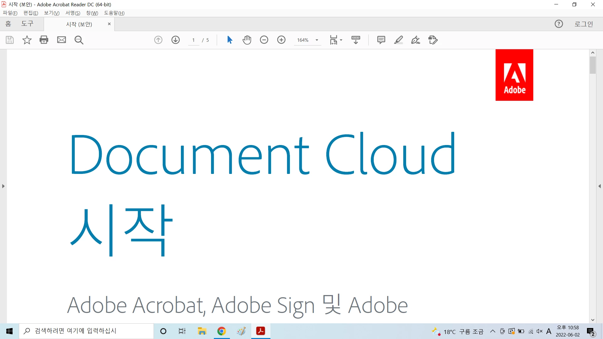 처음 프로그램을 작동시킬 경우, 위 사진과 같이 너비에 맞춰서 페이지가 설정될 경우가 있습니다. 해당 문제를 해결하기 위해 'Ctrl+0' 단축키를 활용하여 한 페이지를 전체에 맞출 수 있습니다.