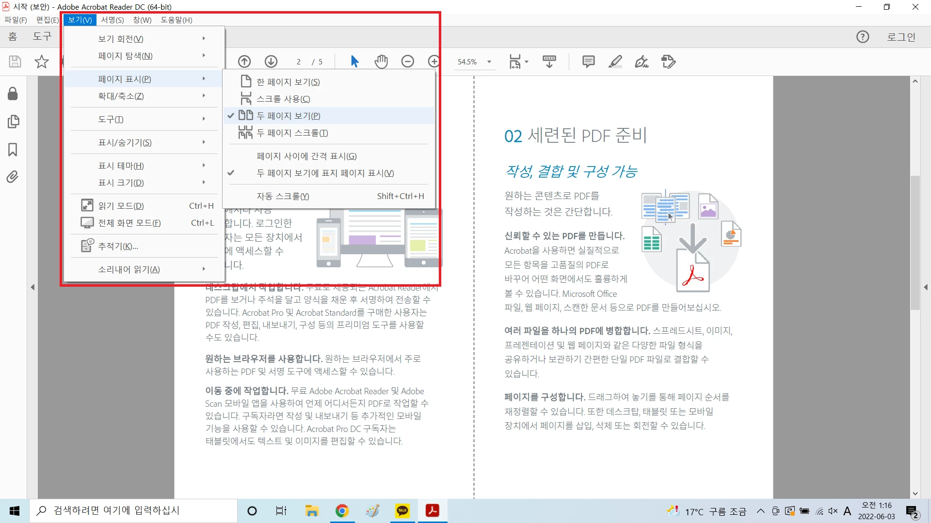 "최신버전 아크로밧리더의 두페이지 보기" 를 알려주세요.