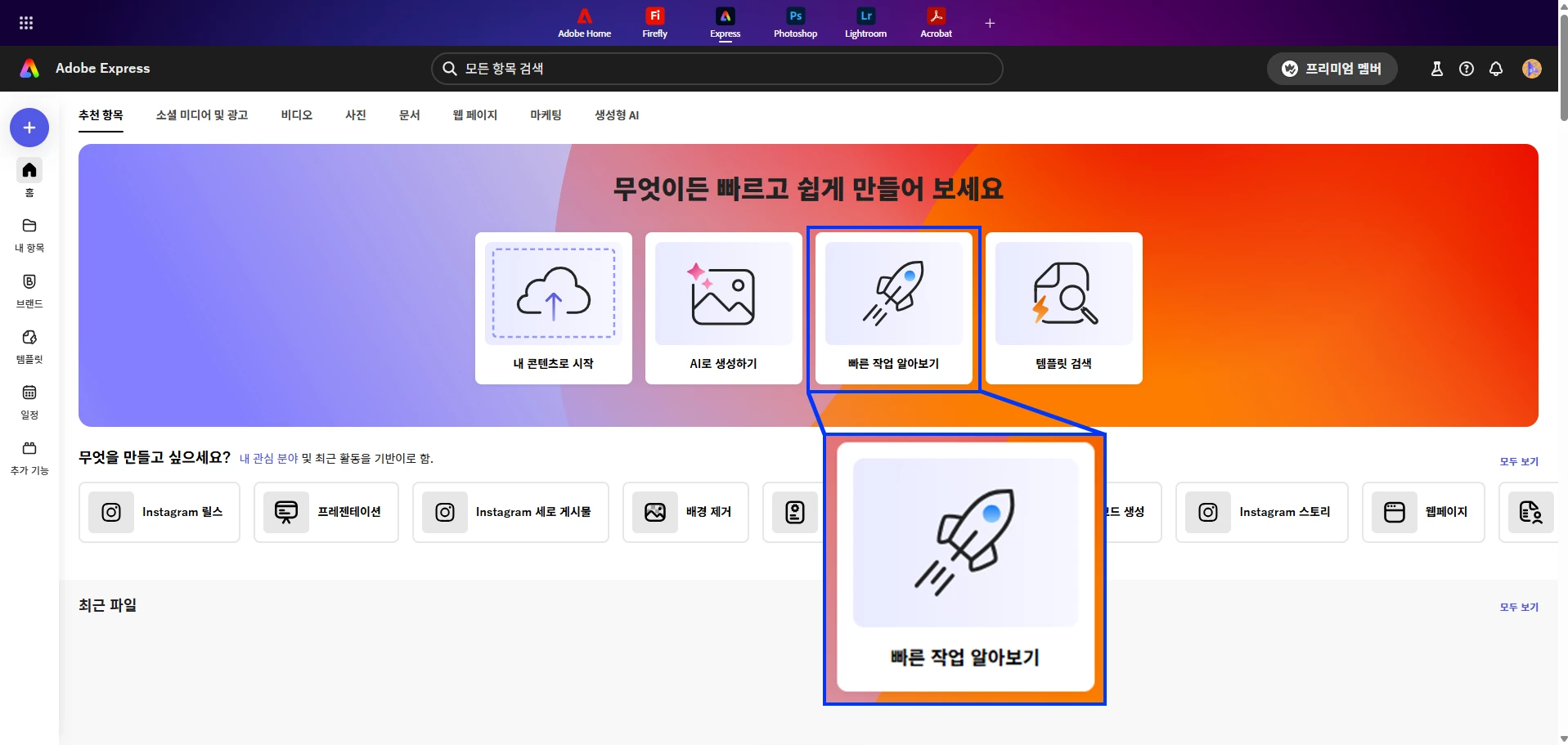 홈페이지 링크에 접속해 Adobe 계정에 로그인 하고 Express를 곧바로 실행 할 수 있습니다!