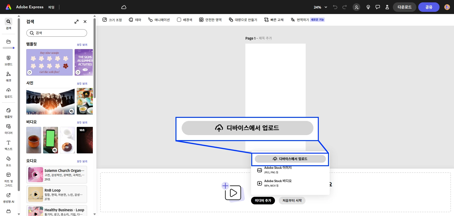 이 중에서도 PC 내 리소스를 이용하실 생각이시라면 [ 디바이스에서 업로드 ] 를 눌러주세요!